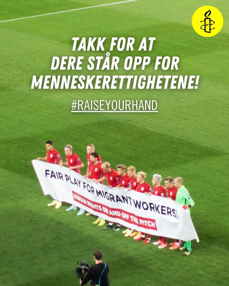 hadde hun støtte fra 280.000 mennesker som hadde signert en Amnesty-appell til FIFA om å legge press på Qatar for arbeidslivsreformer. Landslagssjef, Ståle Solbakken, konsulterte også Amnesty. Det vakte oppsikt da det norske landslaget i en kvalifiseringskamp tok oppstilling på gressmatta iført hvite t-skjorter med påskriften «Human rights – on and off the pitch», og landslaget opprettholdt markeringene i alle kvalifiseringskampene til VM. Bildene av Martin Ødegaard og laget med den klare beskjeden til vertslandet Qatar, gikk verden rundt.