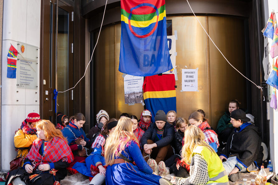 Inngangen til Olje- og energidepartementet i Oslo er sperret av samisk ungdom. De er alle kledd i kofter, vrengte kofter. Et samisk tegn på protest. Ungdommene er mange, de sitter tause i vinterkulden i februar 2023. Situasjonen er preget av stort alvor. «Urfolksrett er ikke valgfritt», står det på plakater over hodene deres, og foran på bakken ligger et banner med teksten: «Staten bryter menneskerettighetene på Fosen.»
