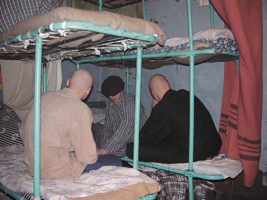 Guttene er enige om at det er hardt ikke å kunne bevege seg. - Det er veldig kjedelig bare å sitte her, sier Zjenja på 16 år. 15 minutter i luftegården i løpet av døgnet er all den friske luften og dagslyset de får. De har ingen kontakt med andre innsatte. På noen av cellene til de mindreårige er det TV, mens andre har en radio. Det er slektninger som har fått lov å gi dem det. Vi så sjakkbrett på noen av cellene. En lærer skal visstnok komme og gi guttene undervisning et par ganger i uken, men de har ennå ikke sett ham.