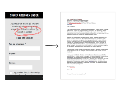 Dersom du ønsker å signere et ferdigskrevet brev så finner du disse på aksjonen slik som du ser på bildet. Hvis du ønsker å skrive et eget brev kan du også gjøre dette. Dersom du ønsker å adressere det på vegne av Amnesty er det viktig at alle opplysningene i dette brevet er funnet på Amnesty Norge eller Amnesty internasjonalt sine nettsider. Er du usikker på noe av informasjonen i brevet ditt?