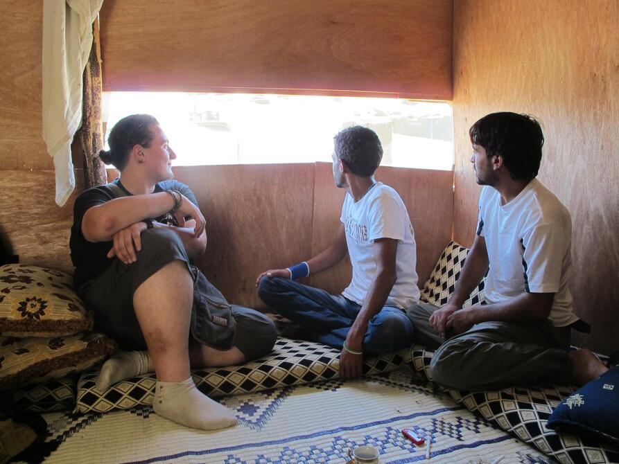Jeg står på taket sammen med Ali og filmer en liten og uoffisiell leir i Bekaa-dalen i Libanon. For et år siden startet Ali Khedr organisasjonen «Syrian Eyes» sammen med noen venner. De jobber for å bedre forholdene for syriske flyktninger i Libanon. Leiren Jarahieh består av omtrent trehundre plasttelt og skur som flyktninger fra Syria har satt opp på et jorde de har leid av en libanesisk bonde.