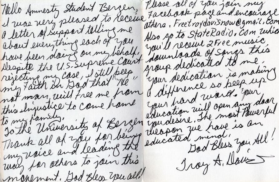 Brev fra Troy Davis til studenter i Bergen