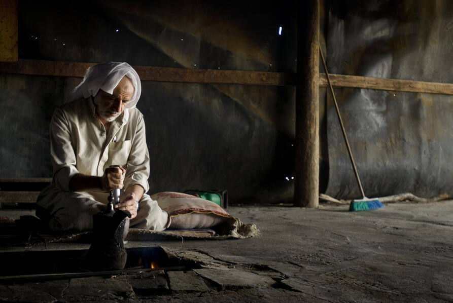 Kaffebønnene har fått den riktige, brune fargen. Lukten av nyristet kaffe brer seg i teltet. Sjeik Abu Afash støter kaffebønnene i en morter. Den tradisjonelle møteplassen i den beduinske kulturen er rundt ildstedet i teltet.