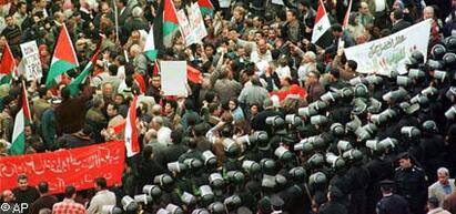 Sinte og ofte voldelige anti-krigsdemonstranter som prøvde å marsjere mot amerikanske ambassader i arabiske hovedsteder ble møtt med brutal politimakt.