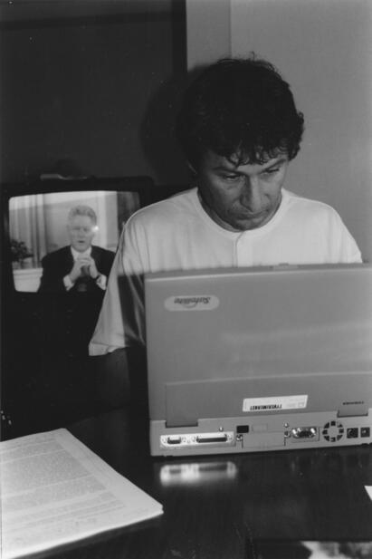 Michigan forsvinner i skylaget mens USAs president, Bill Clinton, ser inn i videokameraet i Det hvite hus og forklarer at han mener leppe-kontakt ikke ligger innenfor hans definisjon av seksuell aktivitet.