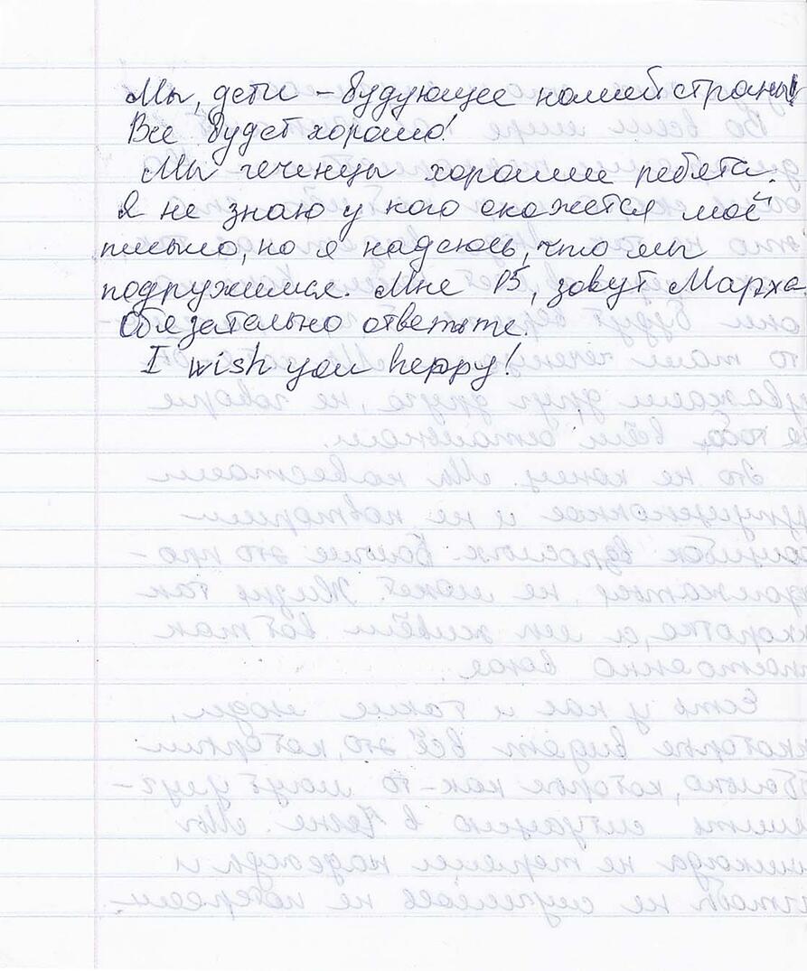 «Kjære våre jevnaldrende! Hvordan går det med dere? Hvordan er situasjonen i landet deres? Vi bor i en teltleir for flyktninger i Ingusjetia. Vi bor ikke så verst, sammenlignet med de som fortsatt er igjen hjemme i Tsjetsjenia, og som lever i varig frykt. Den første krigen var ikke så ille som denne her som allerede har vart i tre år. Det er forferdelig å tenke på hvor mange som er blitt drept; gamle, kvinner og barn som alle hadde en framtid. Krigen tok fra oss barndommen. Vi må ikke gjøre de samme feilene som de voksne har gjort og la alt gjenta seg. Det finnes folk hos oss som innser dette, som lider og som ønsker å forbedre situasjonen i Tsjetsjenia. Vi vil aldri miste håpet. Vi barna er dette landets framtid. Alt vil ordne seg. Vi tsjetsjenere er greie folk. Jeg vet ikke hvem som kommer til å lese dette brevet, men jeg håper vi kan bli venner. Jeg er 15 år og heter Markha. Venter på svar. I wish you happy!