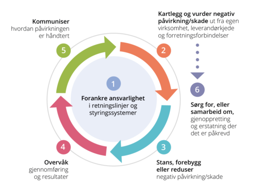 - Trinn 5 omhandler kommunikasjon. Det betyr hvordan virksomheten presenterer sitt arbeid med aktsomhetsvurderinger generelt og en grundigere beskrivelse av risiko og brudd selskapet har bidratt til og/eller er knyttet til. Videre skal virksomheten kommunisere iverksatte tiltak - eller planer den har - for å begrense negative konsekvenser.