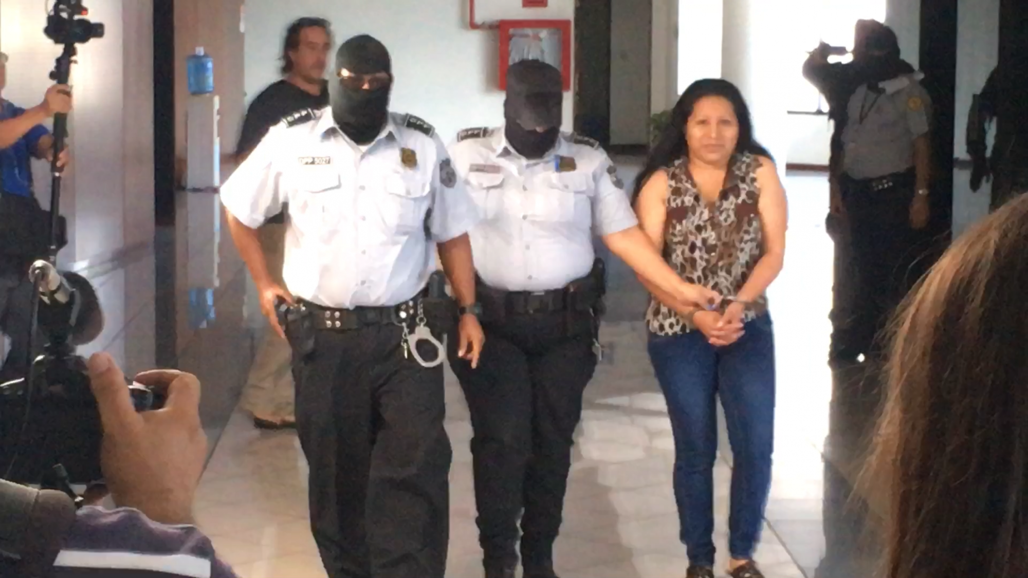 Teodora ankommer rettssalen, ført inn av maskerte politibetjenter.