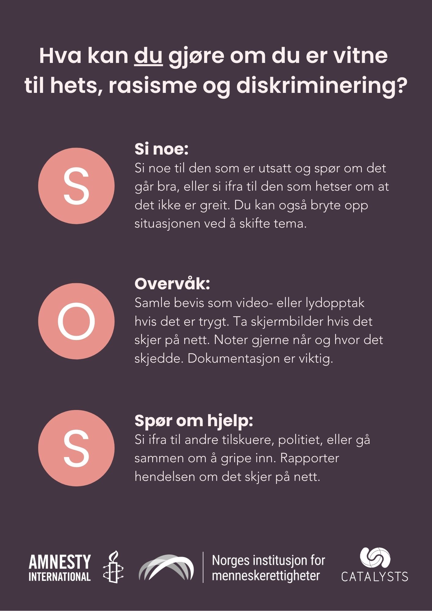 Erfaringer delt av mennesker som har blitt utsatt for hets, rasisme og diskriminering, viser oss at fraværet av at noen griper inn i situasjonen, kan være like sårende som den hetsen man blir utsatt for – Stillhet sårer. Derfor har Amnesty utformet tre undervisningsopplegg som gir opplæring i SOS-metoden, med elever i ungdomsskole- og videregående som målgruppe.